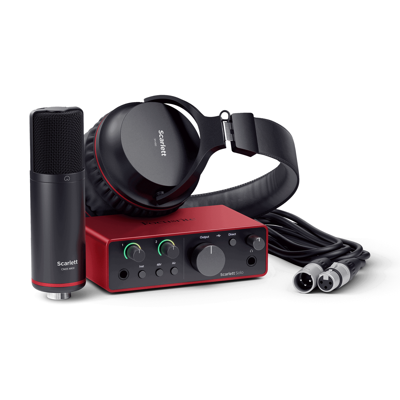 The Focusrite Scarlett Solo Studio Bundle gives you everything you need to start recording music straight away. This complete home studio package includes the Scarlett Solo audio interface, CM25 MkIII condenser microphone, and SH-450 closed-back headphones, along with a powerful software bundle to help you create your first tracks.
